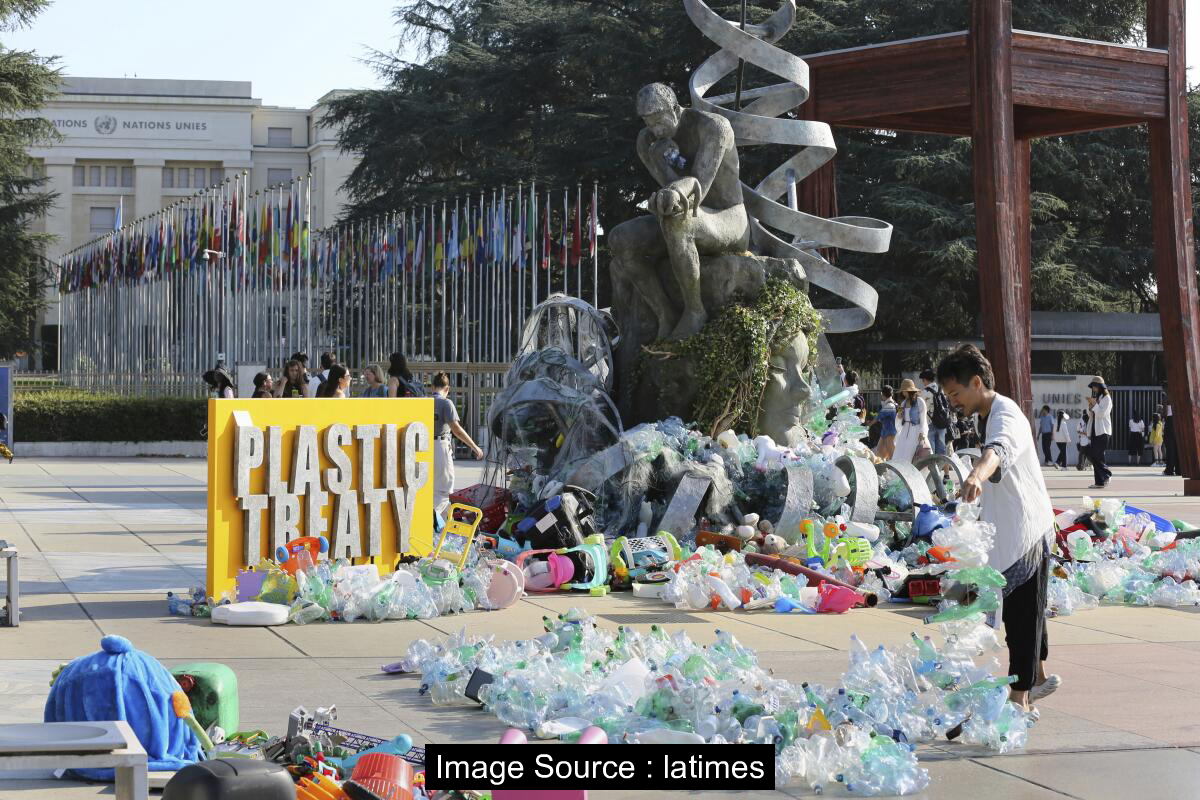유엔 플라스틱 오염 조약 회의서 조각상을 플라스틱 쓰레기로 뒤덮은 예술가